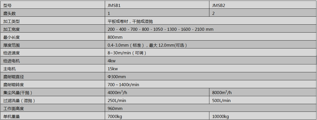 吉力佳JMSB系列其原理是利用含磨料的無紡纖維SB(Scotch-Brite)加工的拋光輥,對金屬板材表面豎向旋轉(zhuǎn)拋光的同時(shí),并做高速橫向往復(fù)擺動的拋光作業(yè)。主要工藝特點(diǎn)是降低磨砂或直紋加工后的板面粗糙度,使其表面觸感更細(xì)膩,從而獲得SB(Scotch-Brite)表面,提高磨砂板的抗污染性。